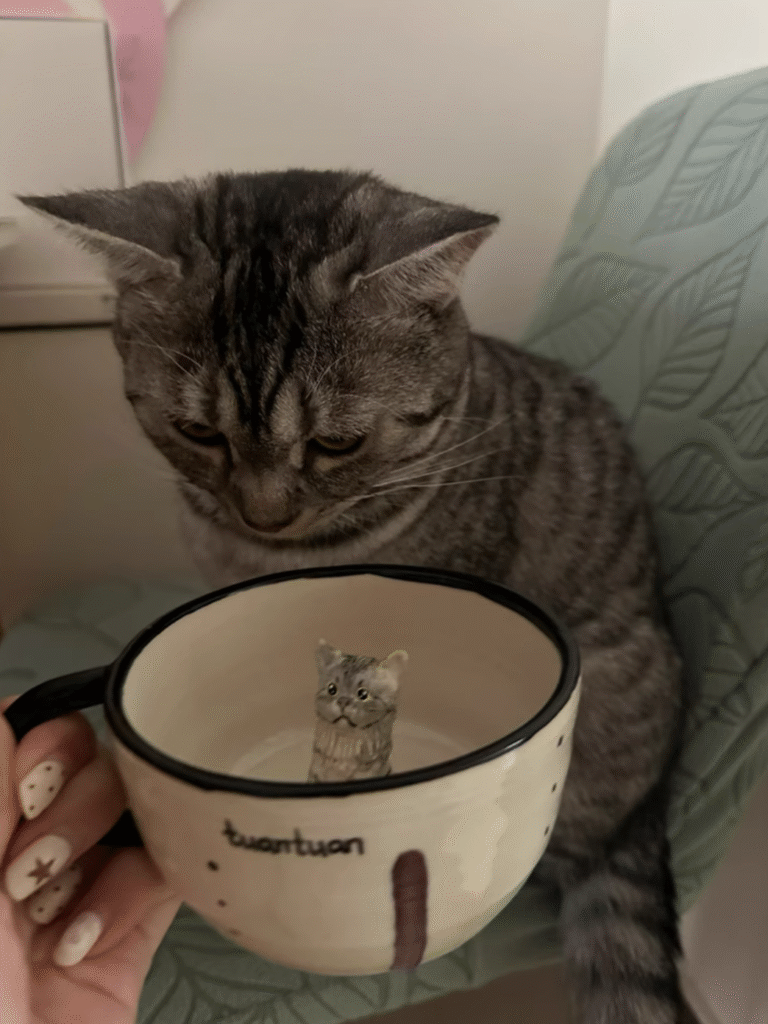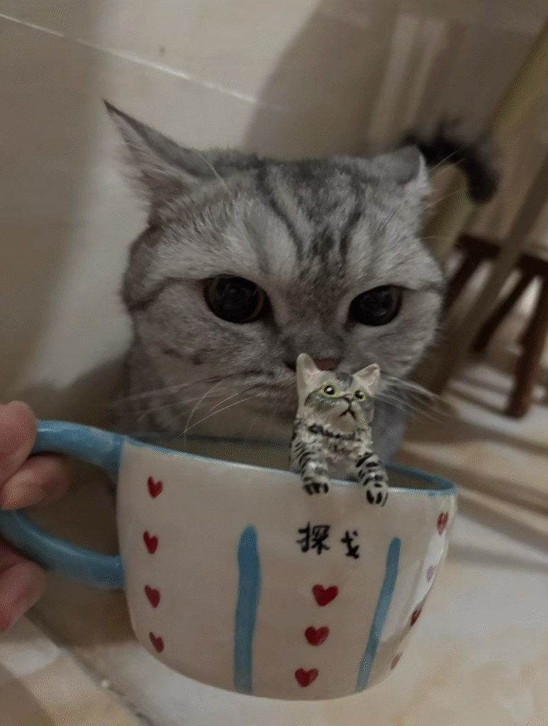 | teacup | Squatting in a cup, Lie down on the rim of the cup, Sit outside the cup, Lie in the cup, Lying outside the cup |
